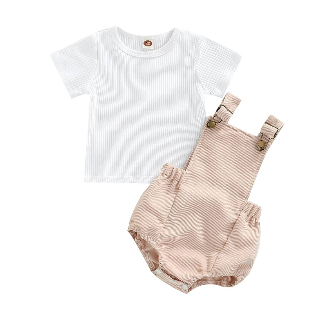 This baby boy outfit includes a short-sleeved white ribbed tee and an adjustable straps romper with snaps, providing a comfortable and stylish outfit for your little one. The soft ribbed texture of the tee provides a cozy feel while the adjustable straps romper with snaps makes for easy diaper changes. The neutral white color allows for versatile styling options and the simplicity of the design makes it a timeless choice for any occasion.