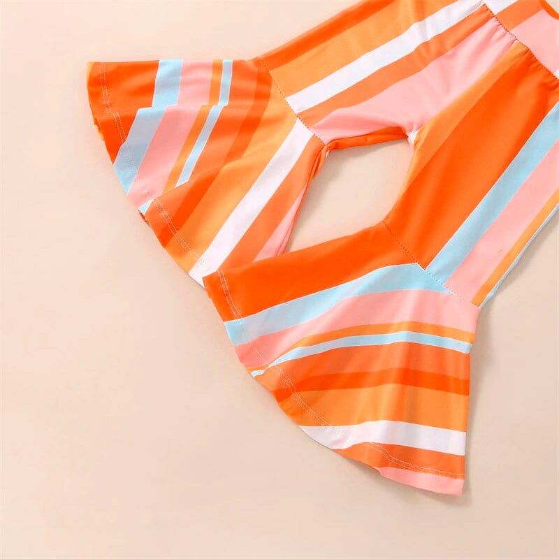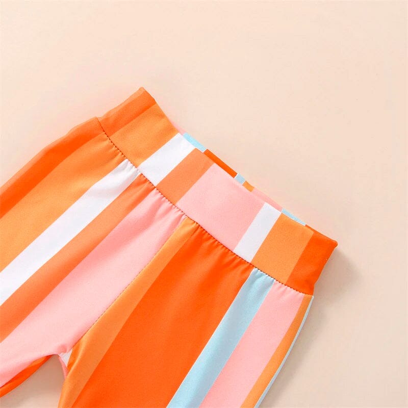 This adorable little girl outfit features a vibrant floral halter top with a cute bow detail on the back, paired with striped flared pants that add a fun and playful touch to the overall look. The top's halter neckline and sleeveless design keep your little one cool and comfortable on warm days, while the soft and stretchy fabric of the pants allows for ease of movement during playtime.