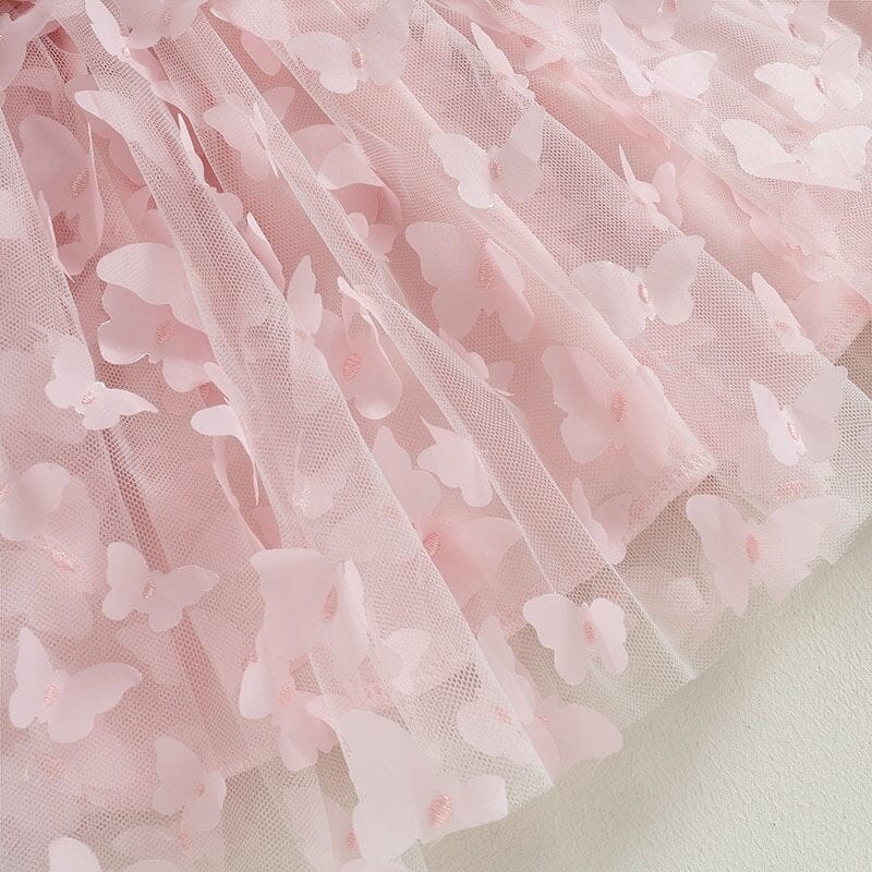 The delicate pink hue harmonizes with the whimsical butterfly pattern, creating a captivating blend of sweetness and grace. Adorned with charming ribbed bows at the front, this dress is a true testament to playful elegance. The tulle fabric adds a touch of lightness and movement, perfect for her every twirl and spin. Whether she's attending a special occasion or embracing everyday adventures, this dress effortlessly combines comfort and beauty.