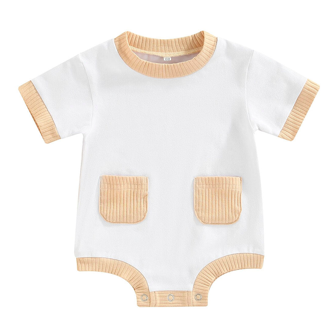 This unisex baby short sleeve bodysuit is a must-have for your little one's wardrobe. Made with ribbed fabric, it is soft and comfortable against your baby's delicate skin. The bodysuit features adorable pockets on the front that add a touch of style to this classic piece. The neutral color makes it versatile for mixing and matching with other outfits, and perfect for everyday wear.