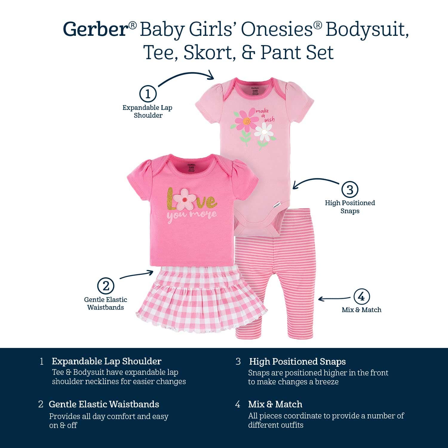 4-Piece Baby Girls Summer Blossom Onesies庐 Bodysuit, Tee, Skort & Pant Set