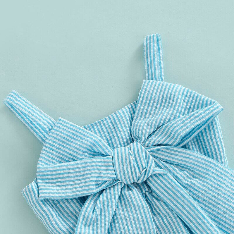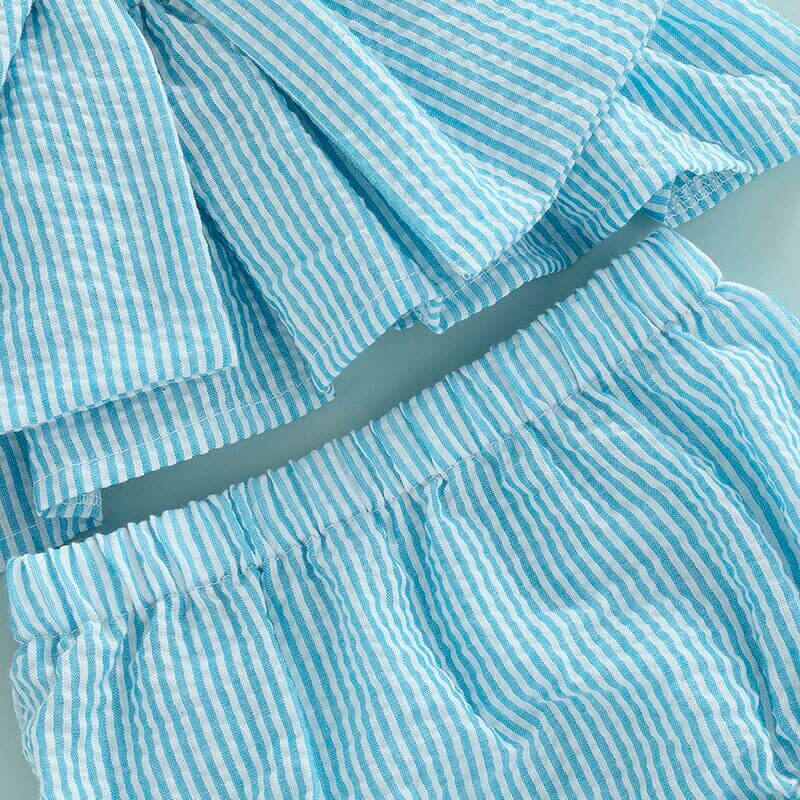 - Blue striped top with a big bow and matching ruffled shorts