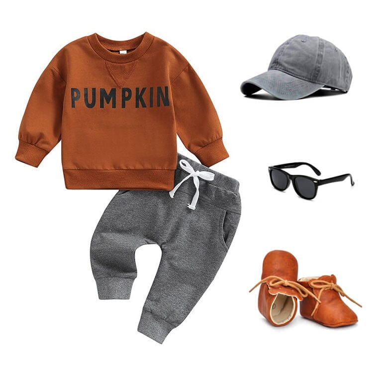 Dress your little boy in style this Halloween with our adorable outfit. The brown sweatshirt features fun and festive lettering that reads "Pumpkin," adding a sweet and playful touch to the ensemble. The soft and comfortable fabric ensures a cozy fit for all-day wear. Paired with the solid pants, this outfit is both cute and versatile.