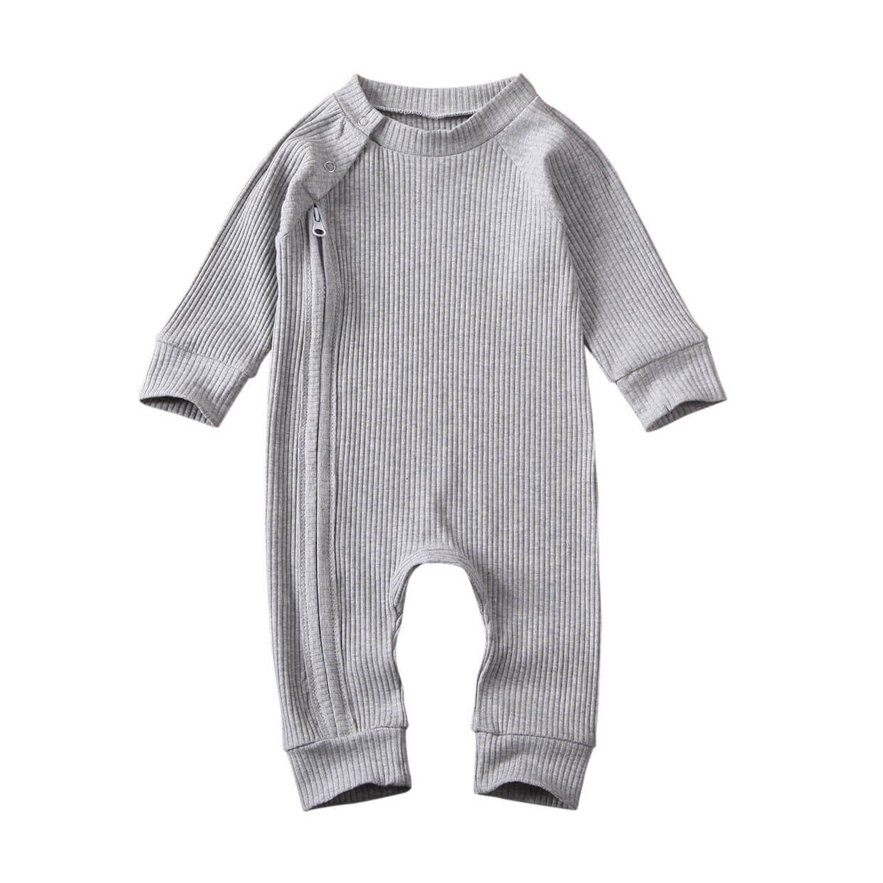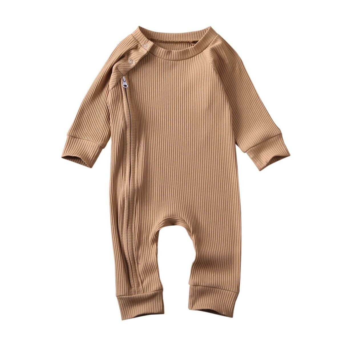This unisex baby long sleeve solid ribbed jumpsuit is a must-have for any baby's wardrobe. With its front zipper design, it's easy to put on and take off, making it perfect for busy parents. Made from soft and cozy ribbed fabric, it will keep your little one warm and comfortable all day long. This jumpsuit is versatile enough to be worn on its own or paired with other pieces for a stylish and comfortable look.