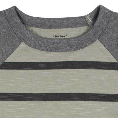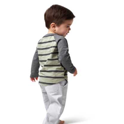 The extremely soft cotton jersey fabric of these raglan tees is perfect for all day wear. High-quality, lightweight, breathable, durable fabric for active infants and toddlers. We had our essentials independently certified with STANDARD 100 by OEKO-TEX® so that you don’t have to worry about harmful substances in your little one’s wardrobe. Includes two long sleeve green stripe and camo printed raglan tees.