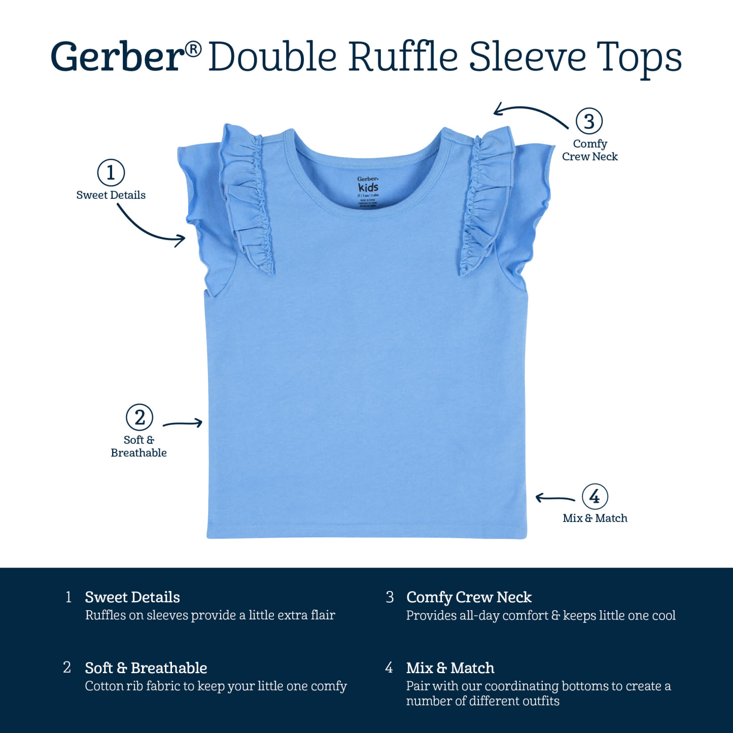 Our 2-pack short sleeve double ruffle tops are the perfect spring and summer staple! Each top is designed for easy dressing and all-day comfort, perfect for infants and toddlers. We use STANDARD 100 by OEKO-TEX庐 certification on products tested in an independent laboratory against a list of more than 400 harmful substances, including PFAS. Pair these shades of blue tops with our coordinating printed or solid leggings and shorts for all day play!