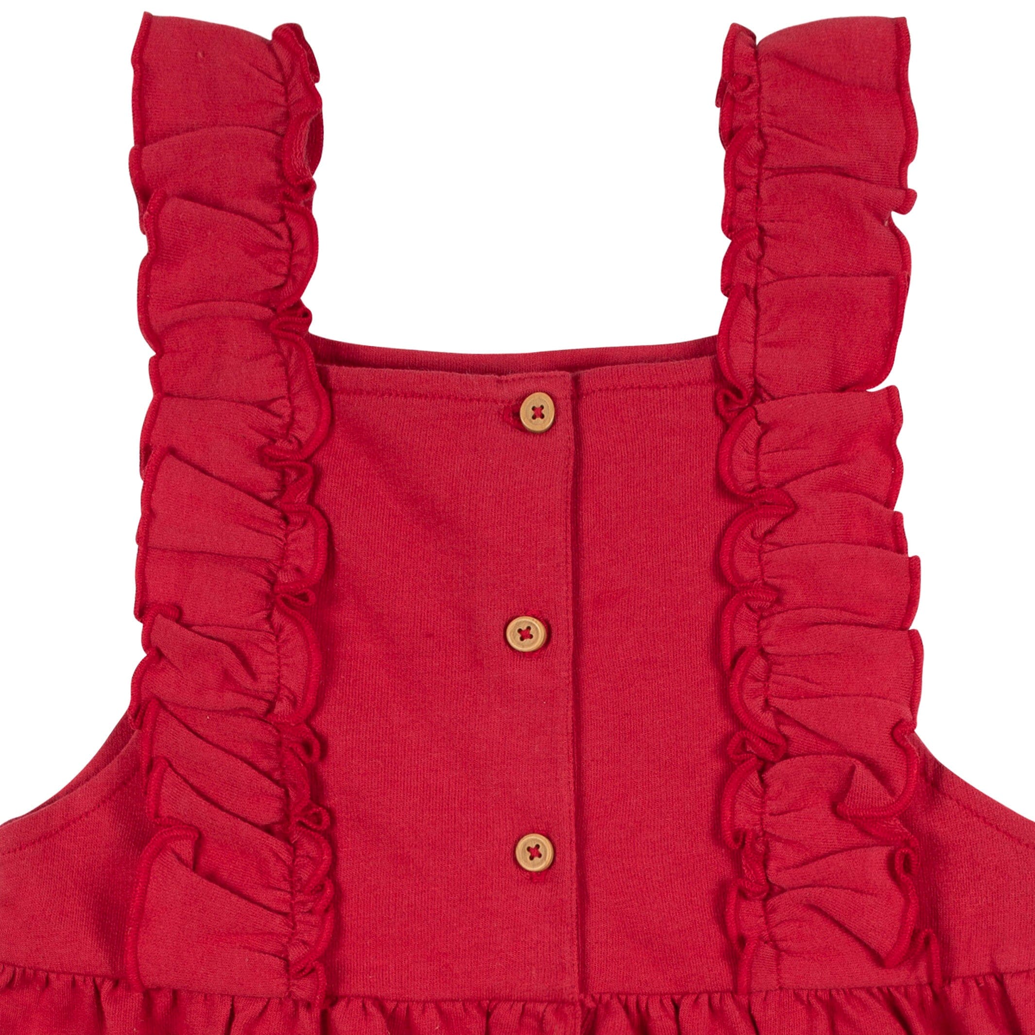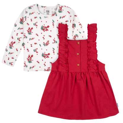 This two-piece red and white outfit is perfect for the fall and winter months. The jumper features adorable shoulder ruffles and a partial button-down front and is made from a warm cotton and polyester blend. Underneath, the cotton shirt has a slight stretch to fit loosely and be comfortable on sensitive skin. The perfect ensemble for picture day or everyday errands, this will be a favorite all season long! Our essentials have been independently certified with STANDARD 100 by OEKO-TEX? so that you don’t have to worry about harmful substances in your baby’s wardrobe. This two piece set includes one red jumper and one long sleeve shirt with matching berries pattern.