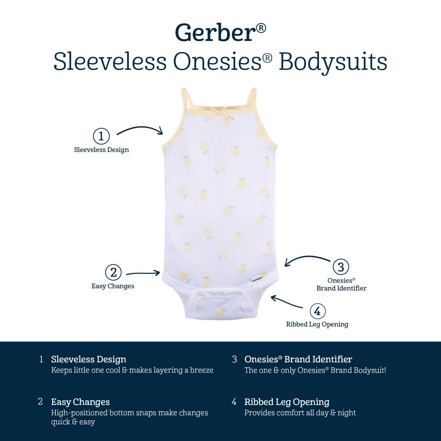 Get excited for Spring and Summer with our sleeveless lemon themed Onesies庐 bodysuits! Our sleeveless bodysuits are an essential part of any baby鈥檚 wardrobe because of their all-day comfort, convenience, and easy-care fabric. We use STANDARD 100 by OEKO-TEX庐 certification on products tested in an independent laboratory against a list of more than 400 harmful substances, including PFAS.