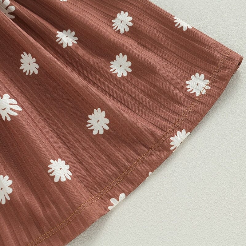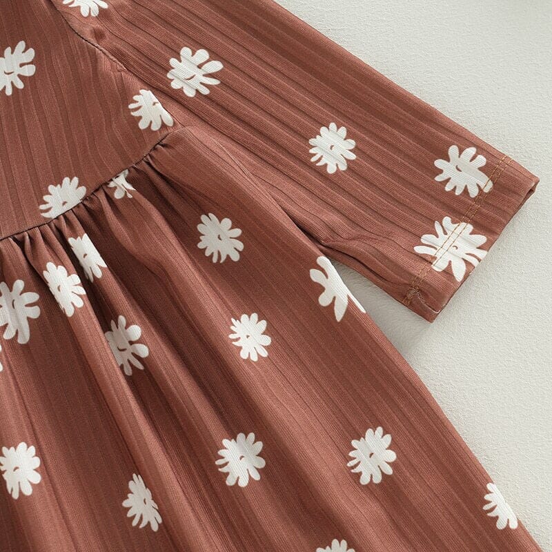 The rich brown hue serves as the perfect canvas for the delicate white flower prints, creating a whimsical and captivating visual. The long sleeves provide comfort and warmth, making it suitable for any season. Whether she's twirling in the garden or attending a special occasion, this dress combines style and charm effortlessly.