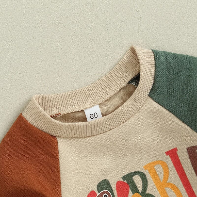 This adorable jumpsuit is designed to add a touch of festive charm to your little one's holiday attire. The playful lettering "Gobble" adds a cheerful and whimsical touch, perfectly capturing the essence of Thanksgiving feasting. With its long sleeves, it's ideal for keeping your baby warm and cozy during the cooler fall days.