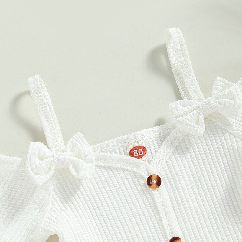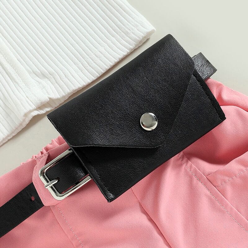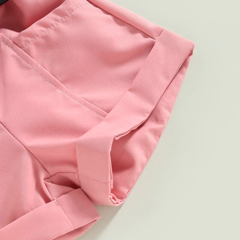 Get your little girl ready for a day out with this cute and comfortable outfit! This set features a white ribbed buttoned tee with two adorable bows on the shoulders and a pair of solid pink shorts that come with a matching belt. The tee has a stylish and modern look, while the shorts are soft and breathable to keep your little one comfortable all day long. The set is perfect for any occasion, from a family outing to a playdate with friends.